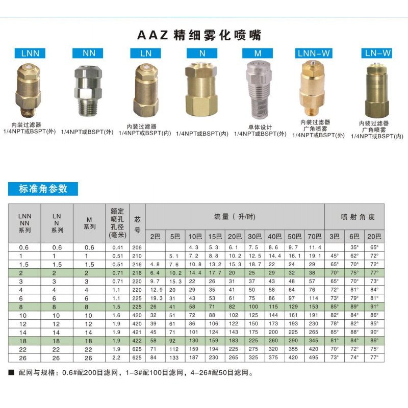 N-W和NN-W系列具有與N系列噴頭相同的結構,并具有一個廣角鑲件,LN-W和LNN-W系列內裝有過濾器