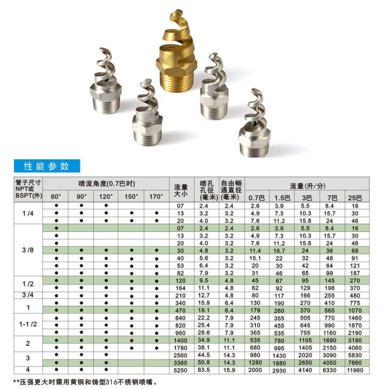 螺旋噴嘴是一種實心錐形或空心錐形噴霧噴嘴,噴流角度范圍可60-170°,在3巴壓力下測試流量范圍為5.5-4140升/分。