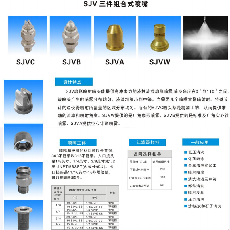 SJV三件組合式噴嘴 SJV扇形噴射噴頭能提供高沖擊力的注流或扇形噴霧,噴射角度在0-100之間,該噴頭產(chǎn)生的噴霧分均勻,液滴 由細(xì)小到中等,當(dāng)需要幾個(gè)噴嘴重疊噴射時(shí),特殊的設(shè)計(jì)邊使得噴
